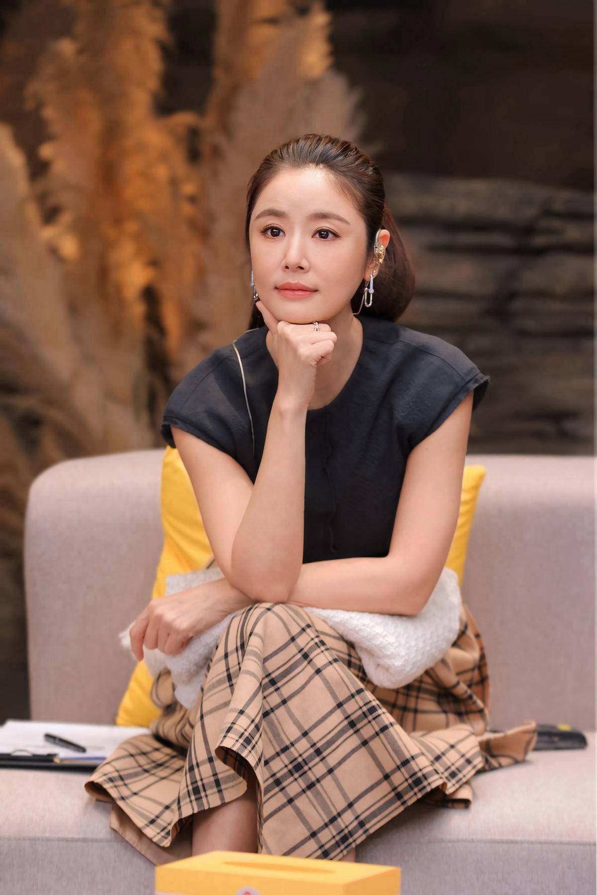 仔细看她这套出圈造型,简直是中年女性的穿搭教科书。黑色小飞袖上衣选得太妙了,圆领设计拉长颈部线条,配上银色耳坠精致感直接拉满。最绝的是小飞袖,把拜拜肉藏得严严实实,肩部线条却显得又直又薄。下半身那条卡其色格纹半裙更是心机,A字裙摆把腰腹赘肉遮得无影无踪,过膝长度露出最细的小腿,三七分比例瞬间拿捏。难怪网友说:“这哪是胖了3斤,分明是把肉都长在了该长的地方!”